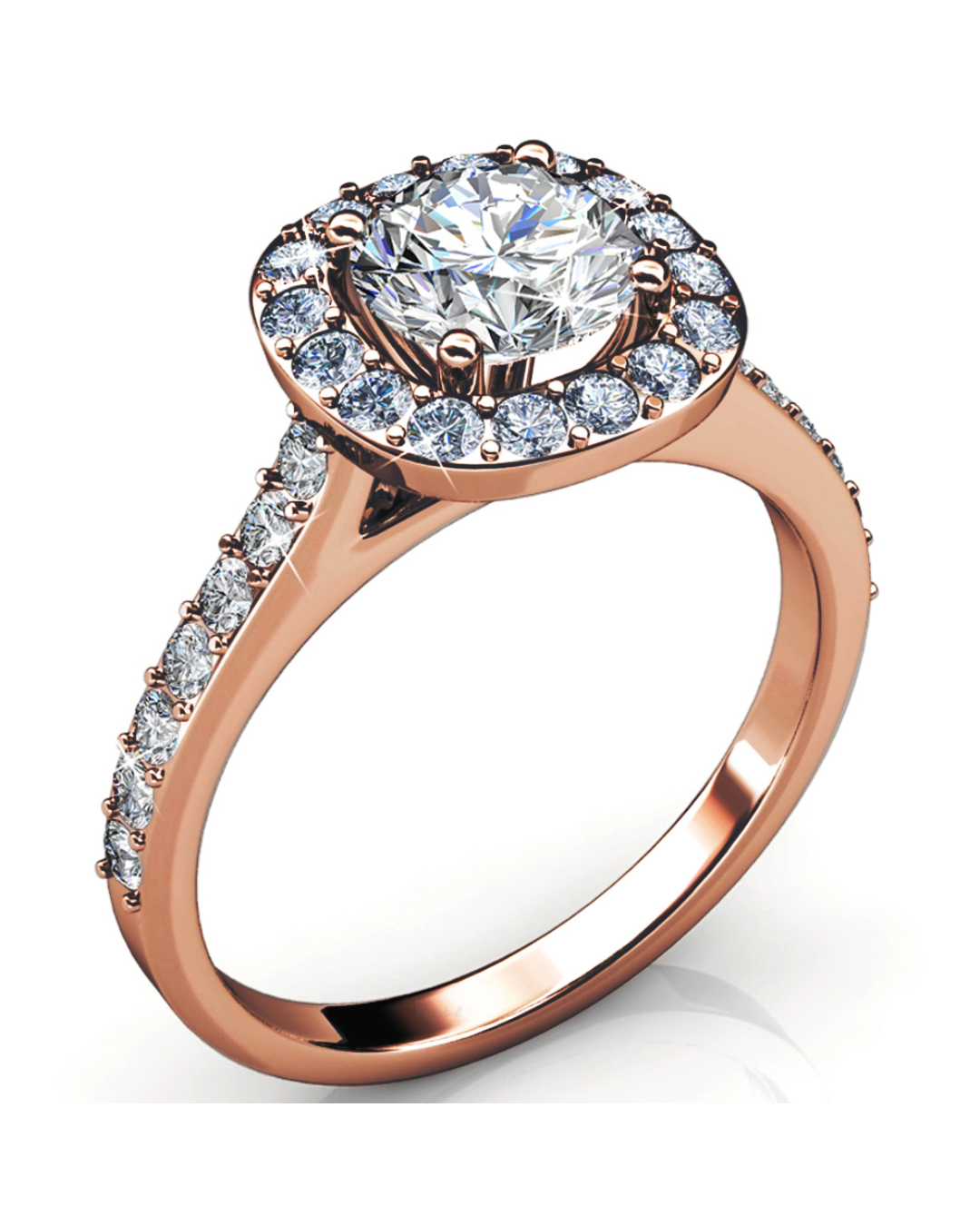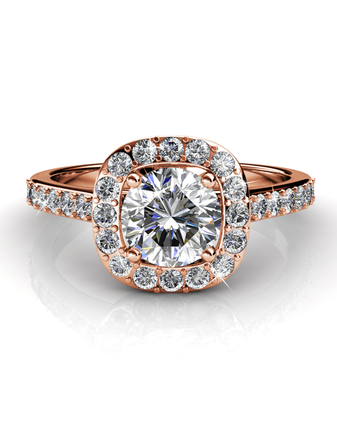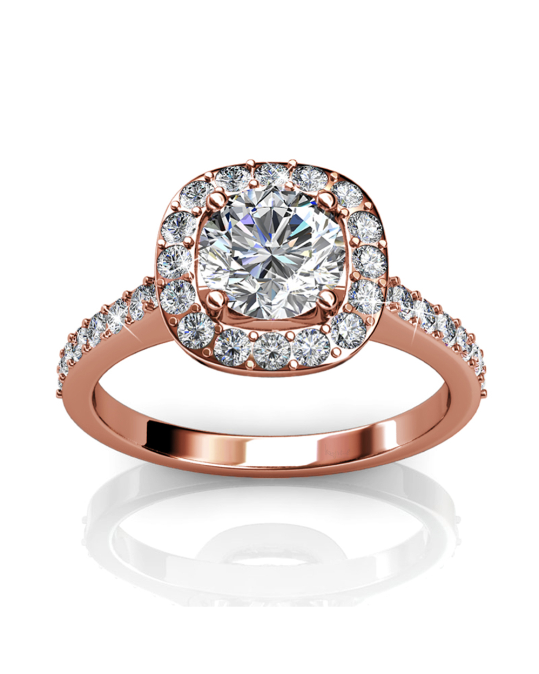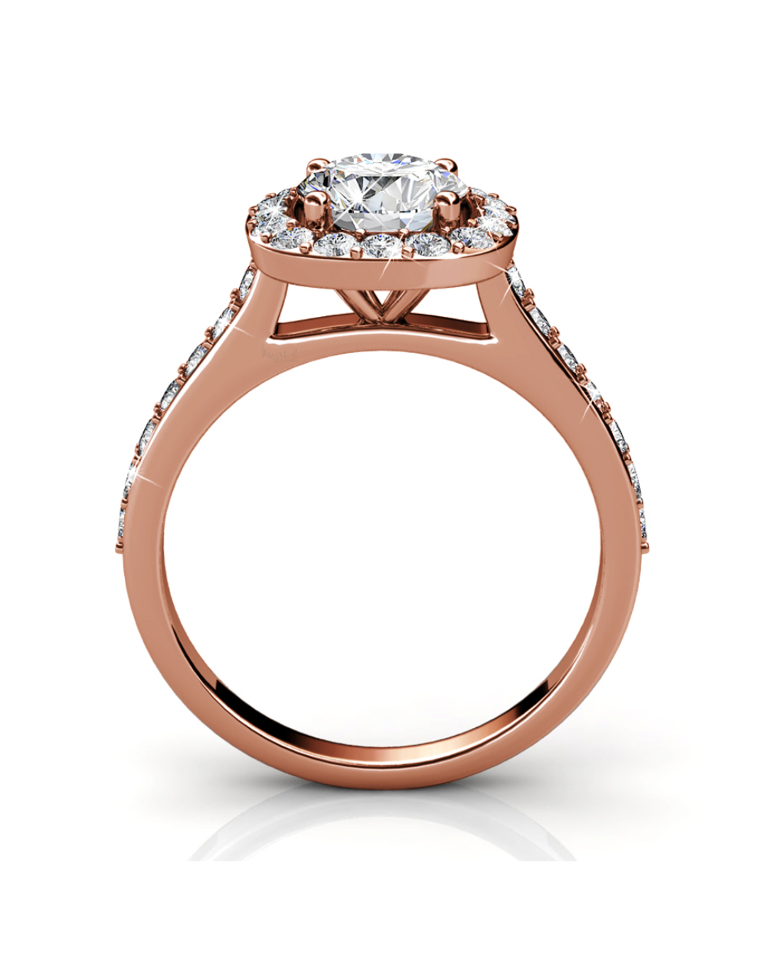 The beauty of this classic engagement ring will surely surprise her. This gorgeous ring is crafted of highly polished 18K Rose Gold plated alloy featuring a beautiful round-cut center stone with a halo of multiple brilliant crystals. Studded along the band are 1 pave-set, round-cut crystals that provide extra shimmer, all made with SWAROVSKI® elements. Trully, a promising piece!