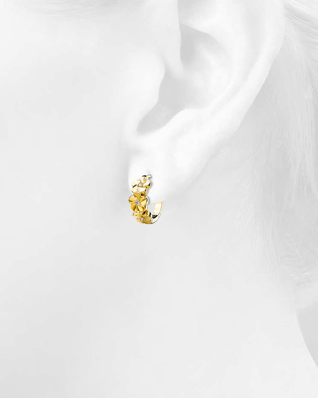 Introducing our exclusive Floral Trio Huggie Earrings, meticulously crafted to add a touch of elegance and sparkle to your everyday ensemble. Embellished with the world-renowned SWAROVSKI® crystals set in luxurious yellow gold, these earrings are designed for those who seek sophistication and timeless beauty in their jewellery collection.