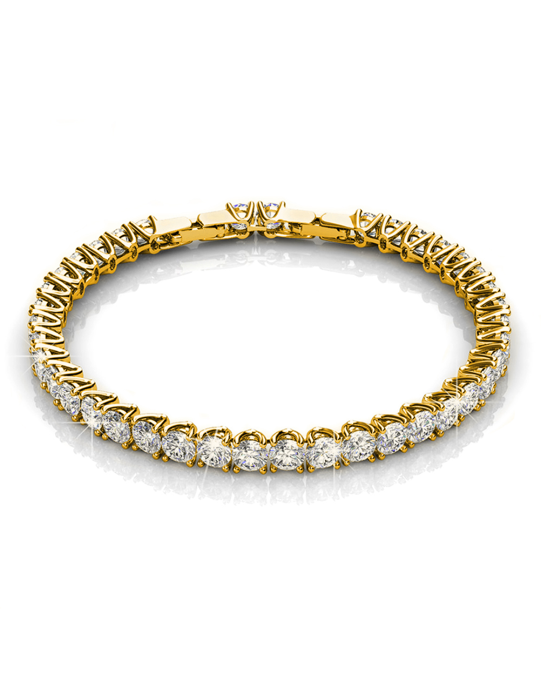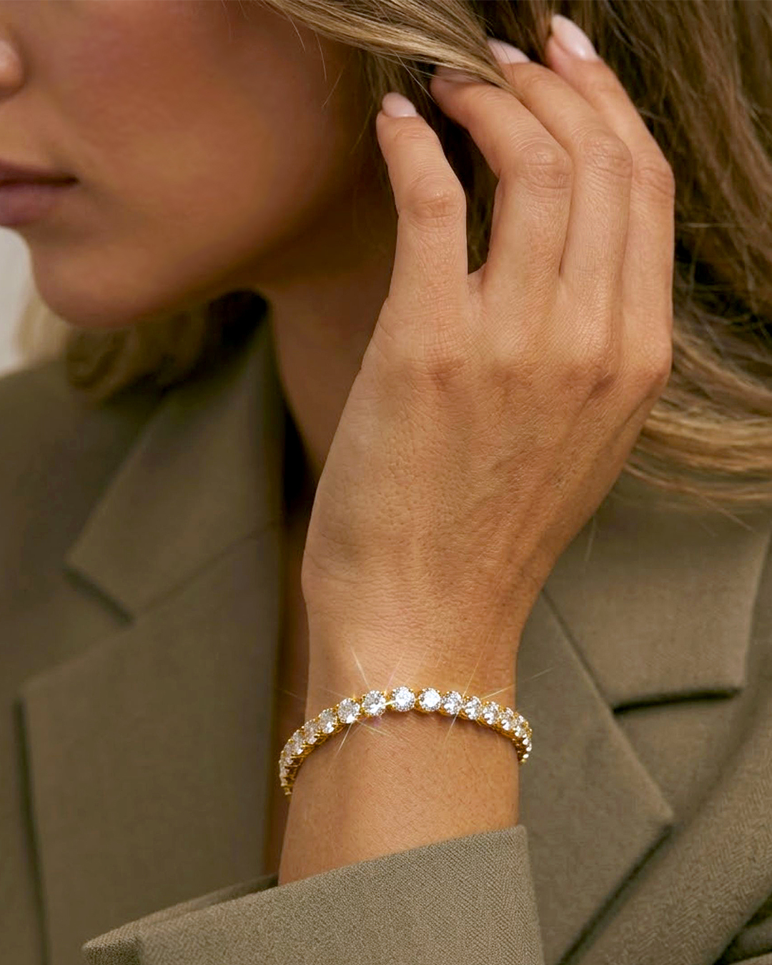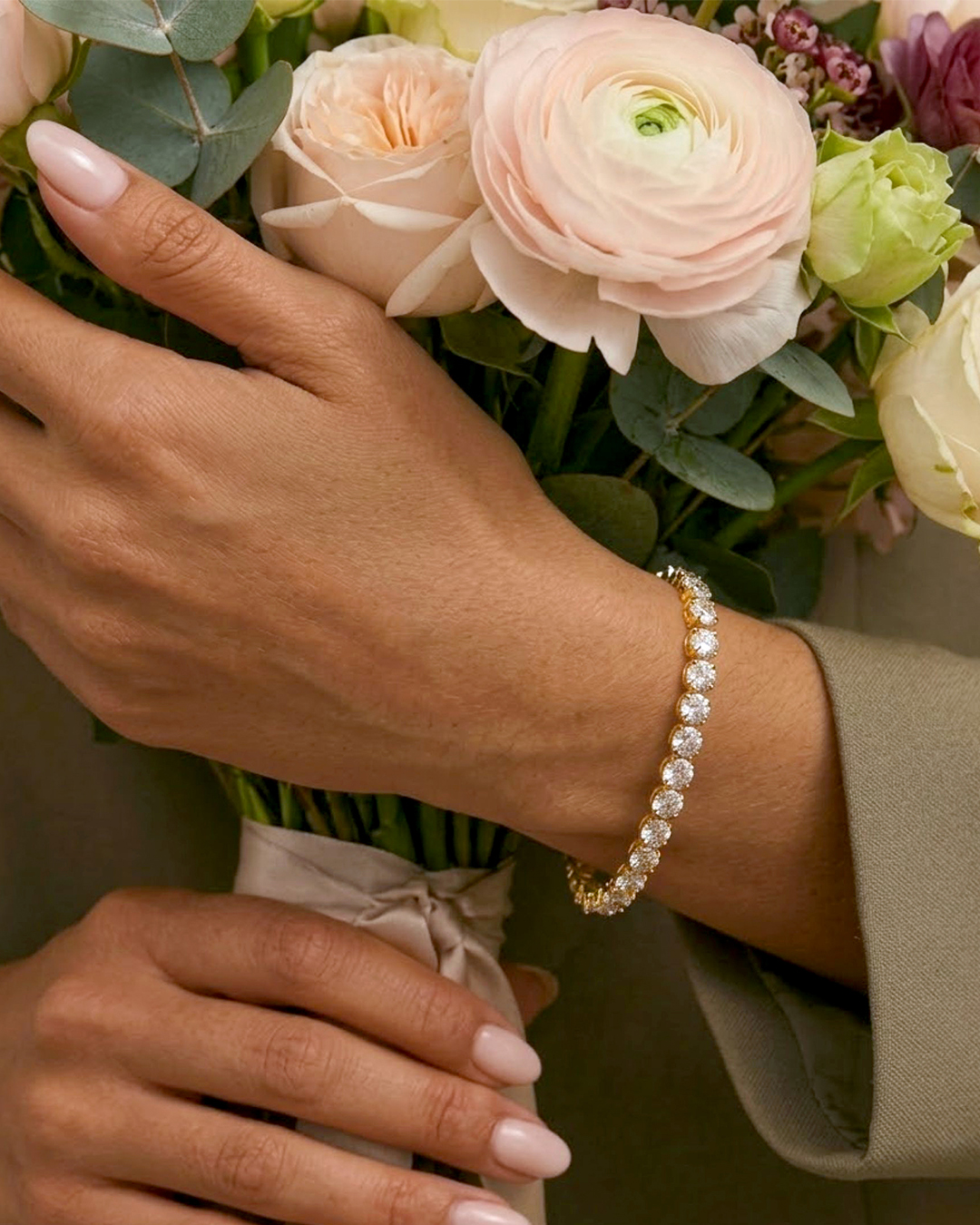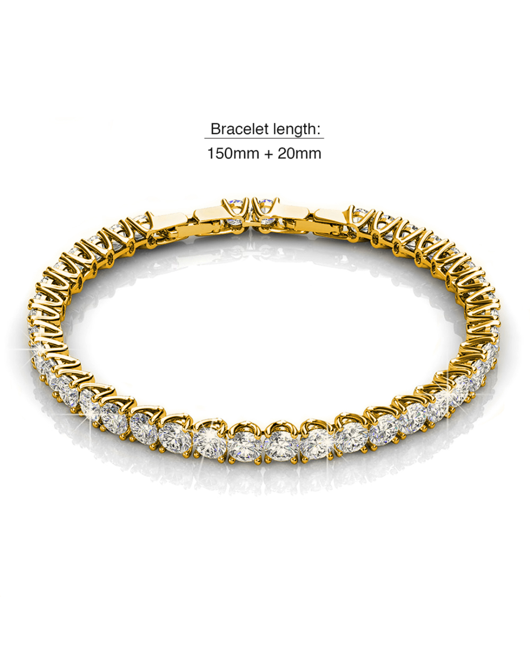 This simple yet elegant tennis bracelet showcases round-cut Crystals made with SWAROVSKI® Elements, prong set in 18K Gold finsh. Perfect for any occasions!