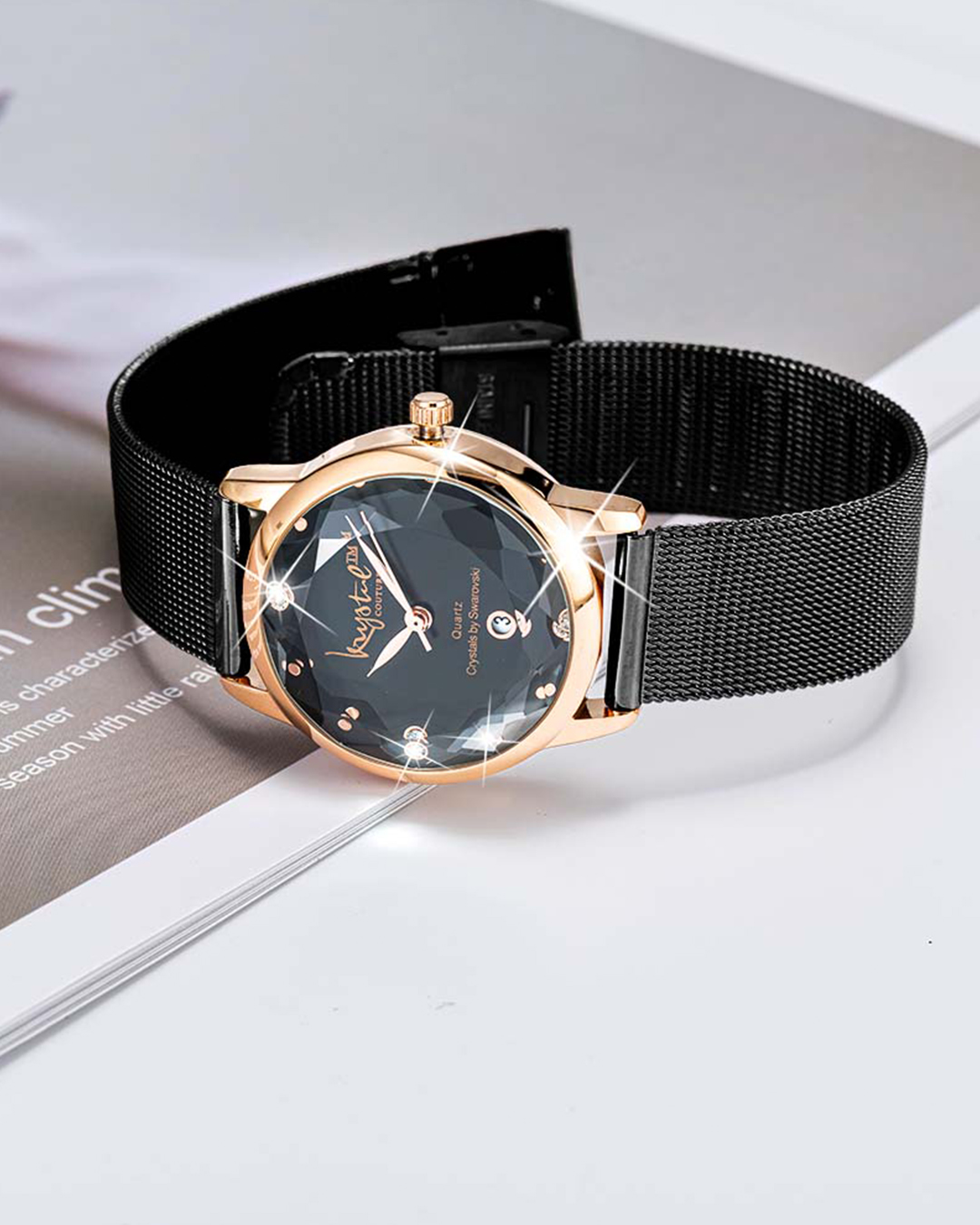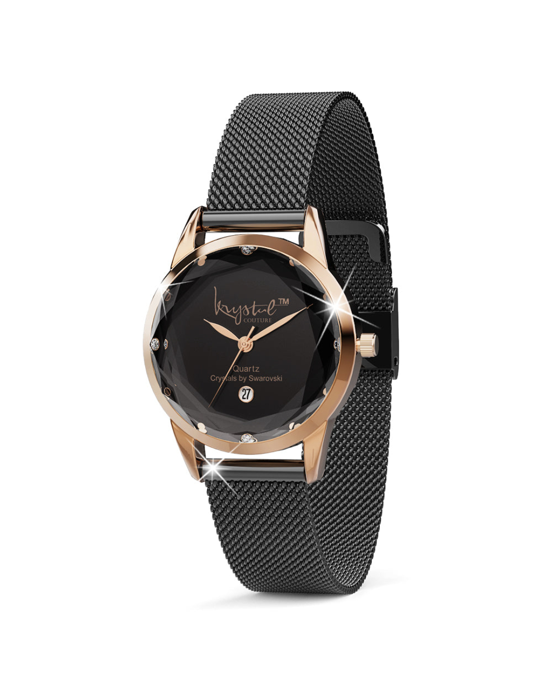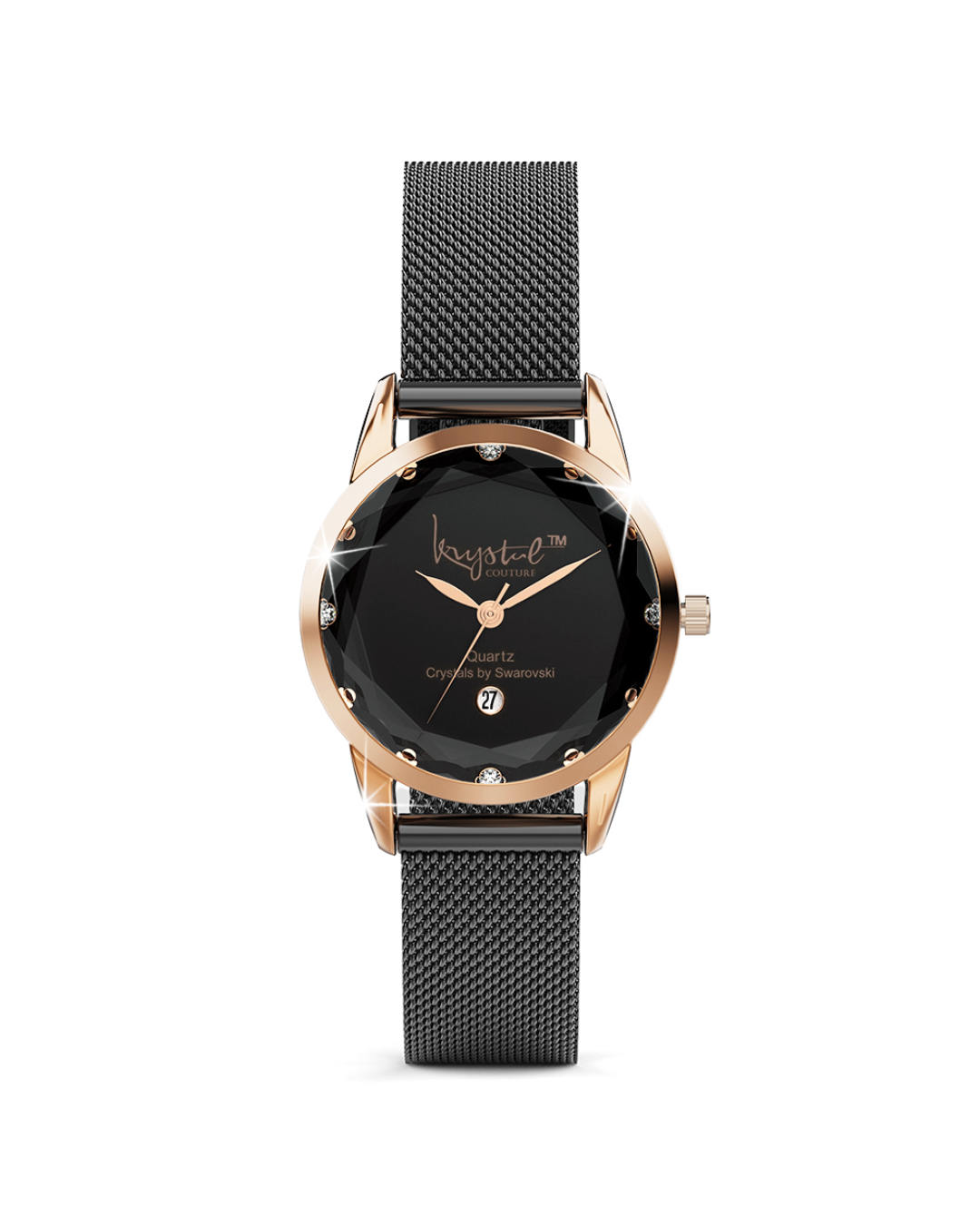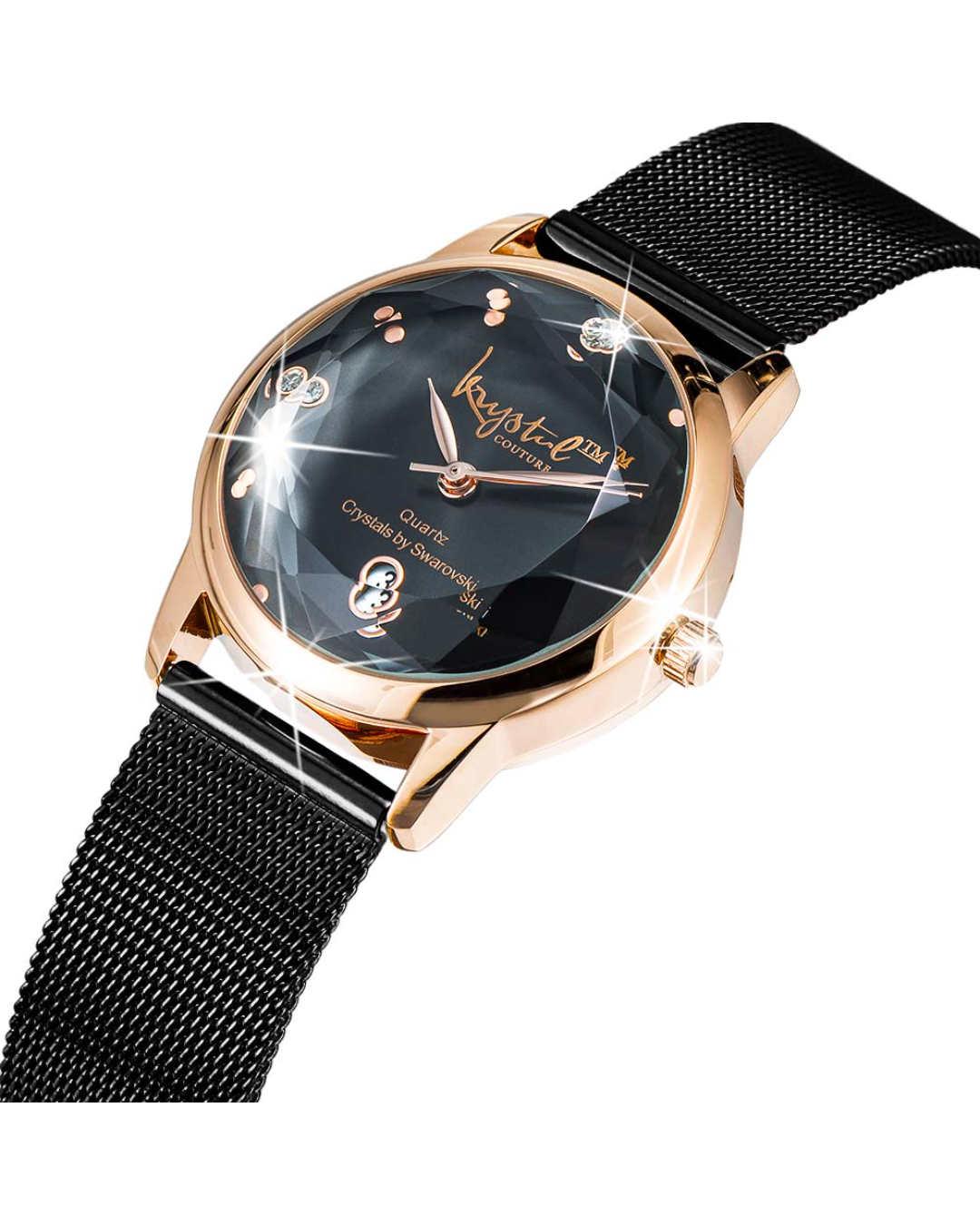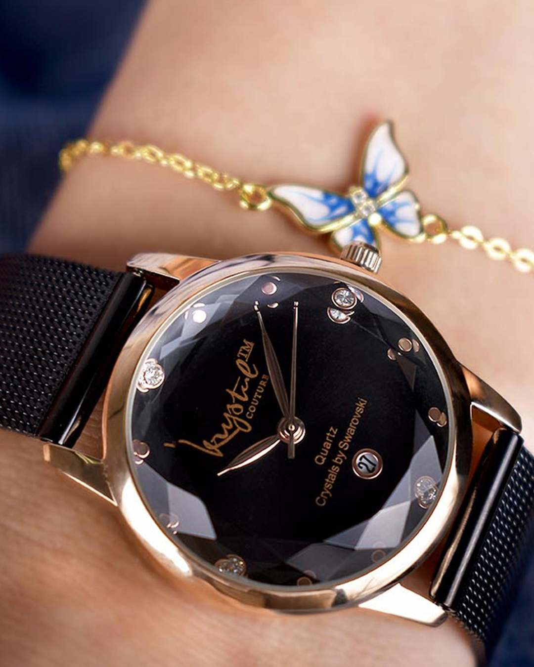 Keep track of time in style with The Krystalline Sleek Rose Gold Black Watch Embellished With SWAROVSKI® Crystals. This classic & traditional timepiece comes complete with a luxurious Rose Gold plated stainless steel strap and blue face combination. Well-crafted with a 30M waterproof alloy, a secure adjustable snap closure and powered by a distinctive quartz movement; making this watch not only beautiful, but practical too!