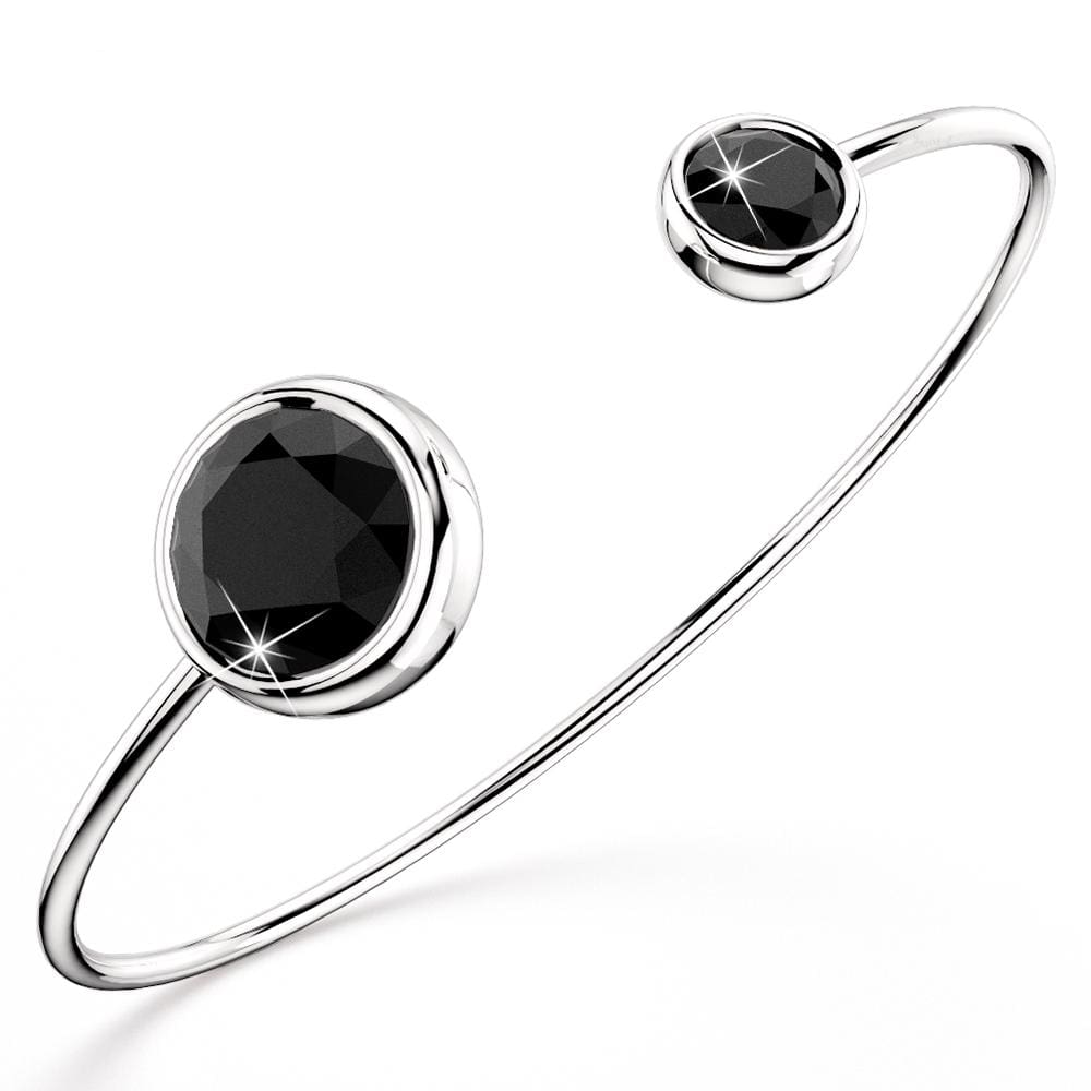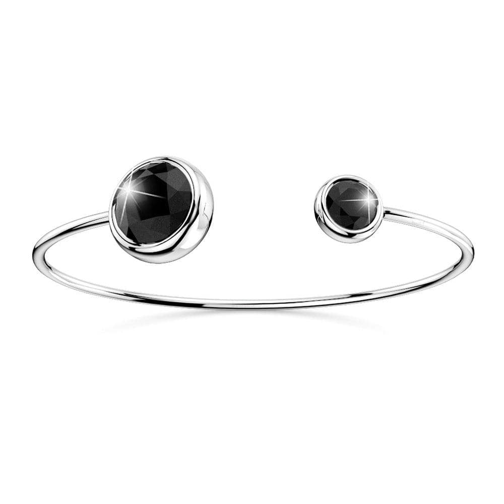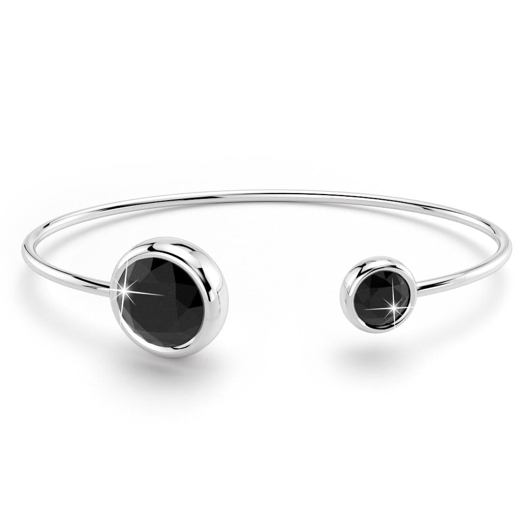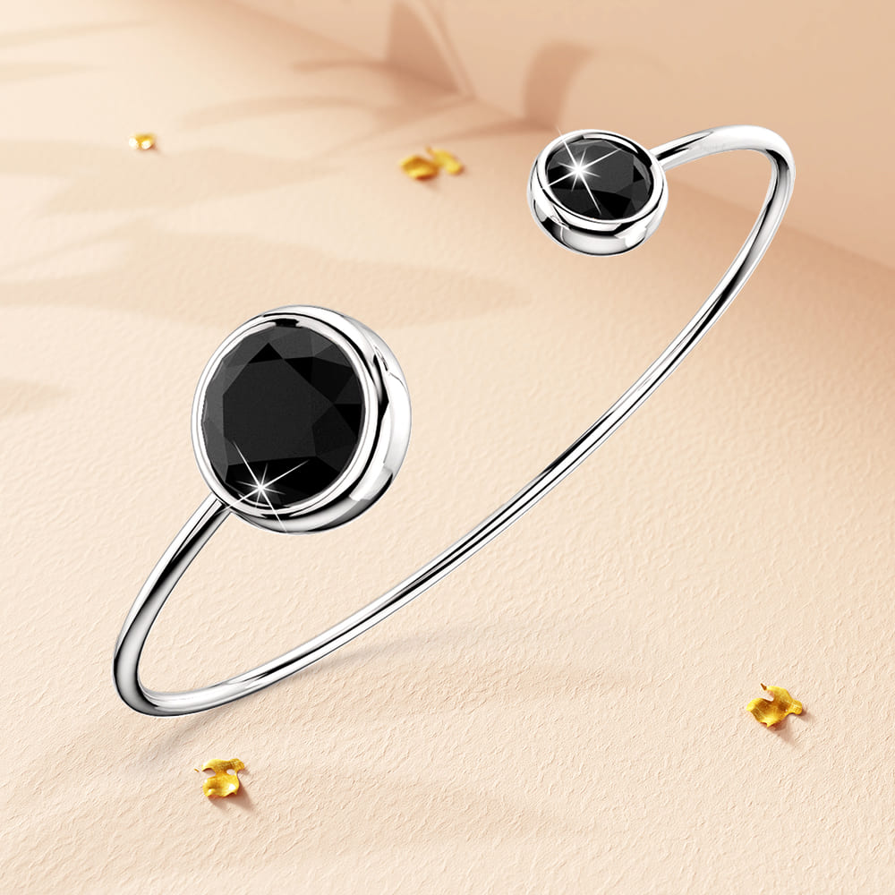 Classy and stunning, this trendy open cuff bangle boasts two dazzling round bezel-set Crystals made with SWAROVSKI® Elements. Crafted of 18K White Gold plated alloy, this bangle is great for all styles and outfits. This chic bangle is made in Korea.