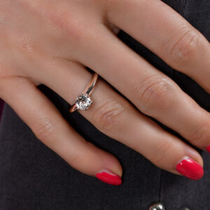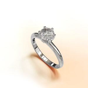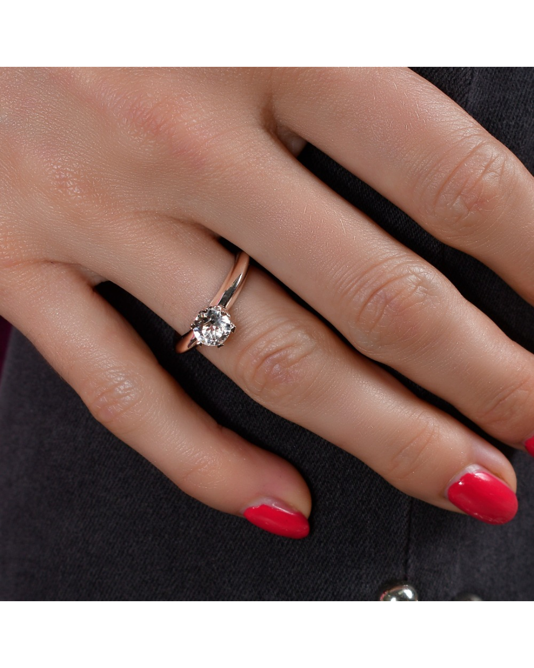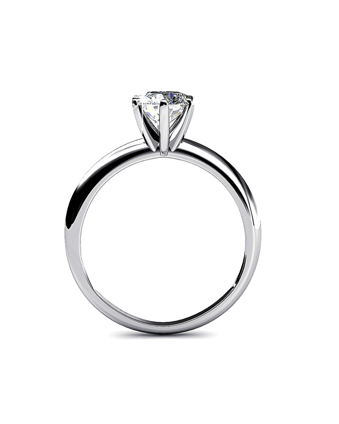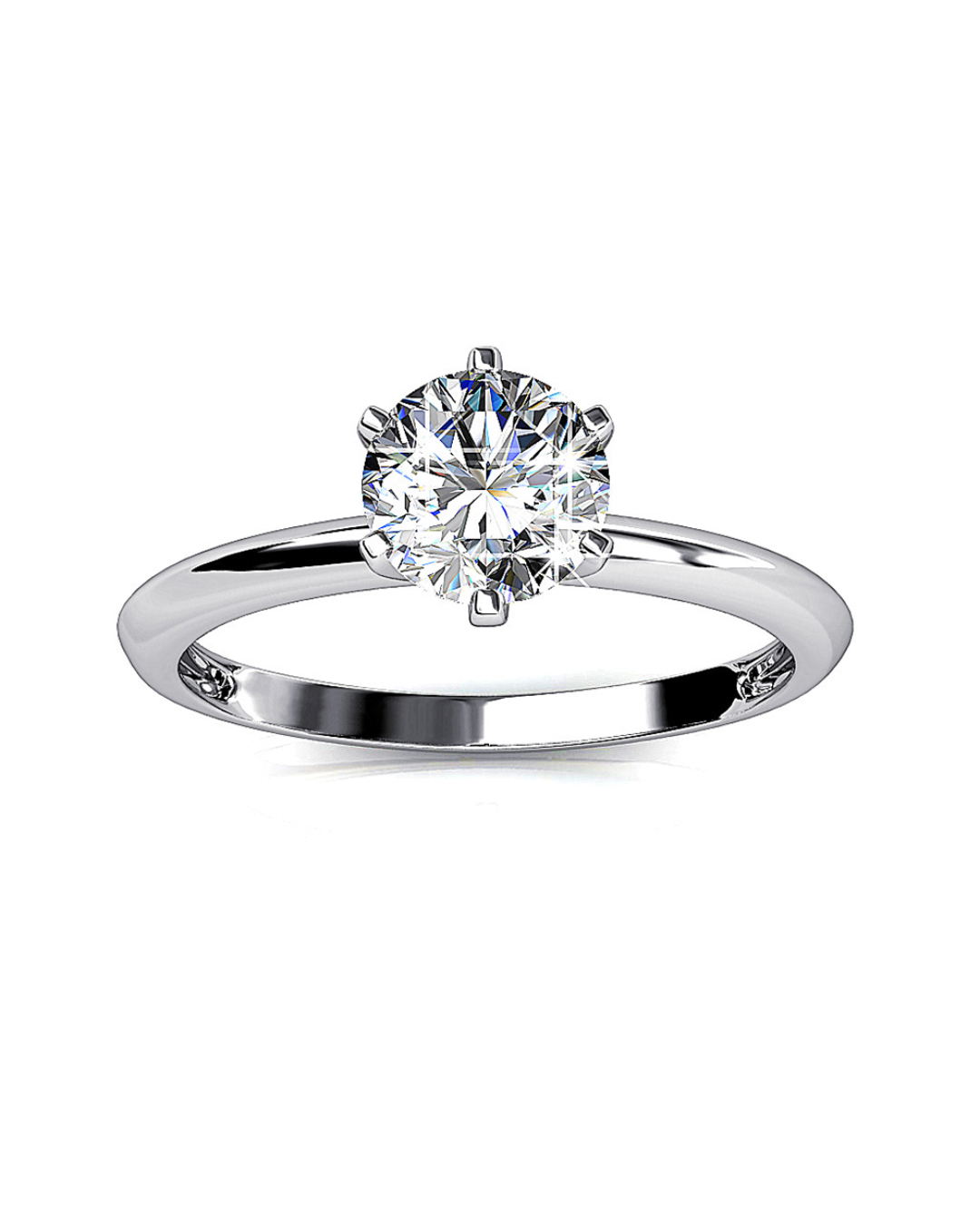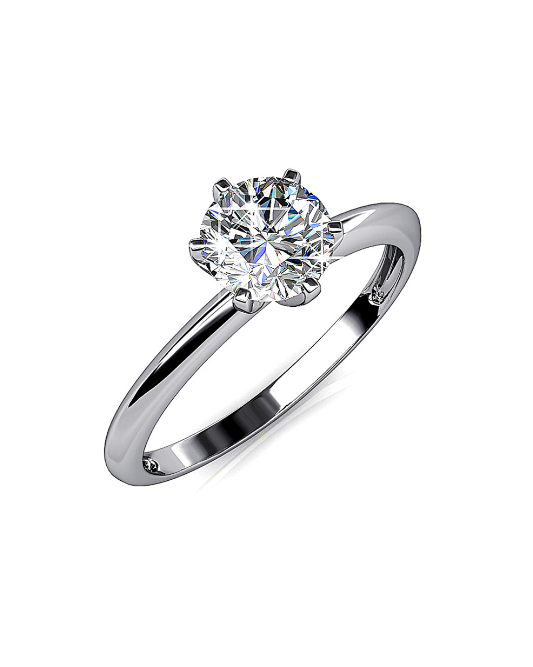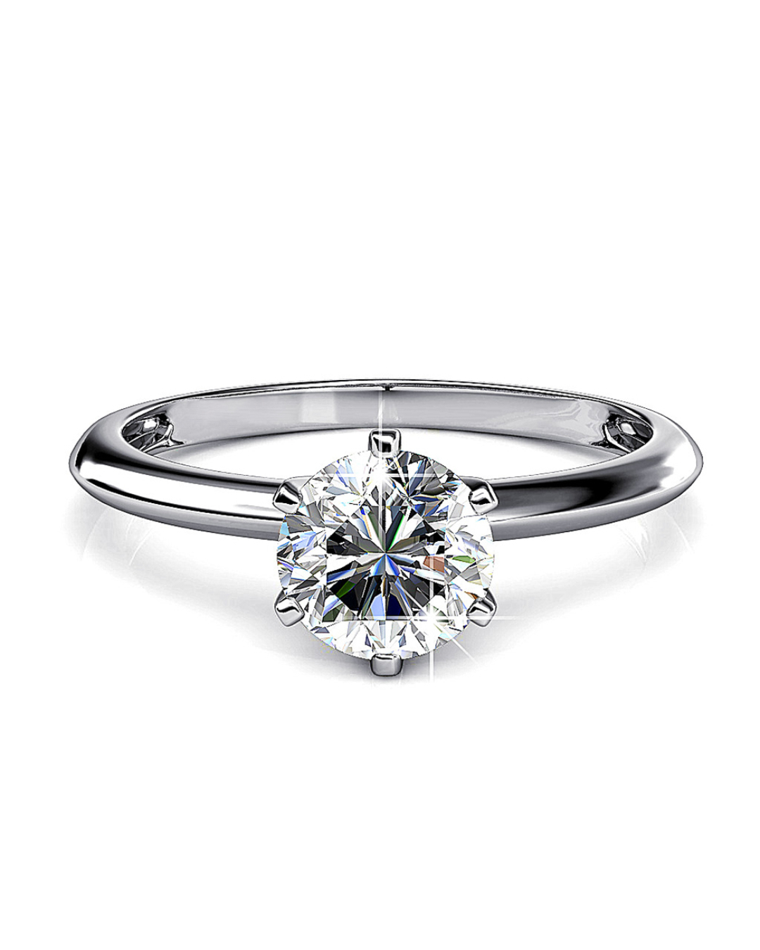 This gorgeous solitaire Engagement ring features a brilliant round crystal from SWAROVSKI® in a six-prong setting. It is crafted of 18K White Gold plated alloy plus extra polished for long lasting shine. Simply stunning!