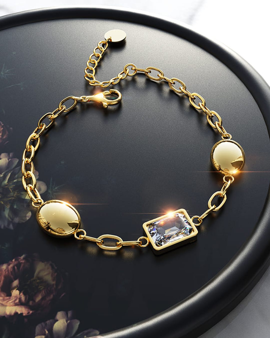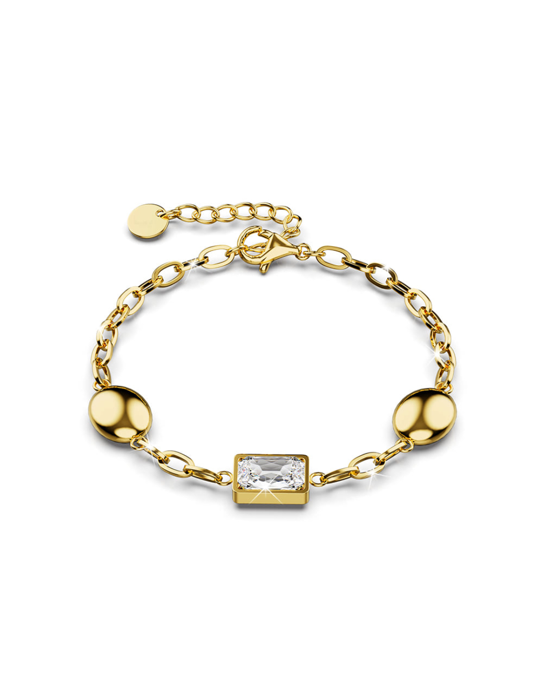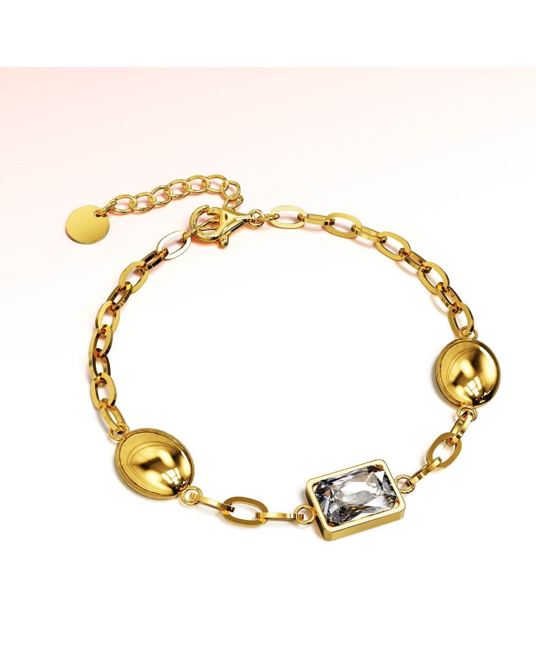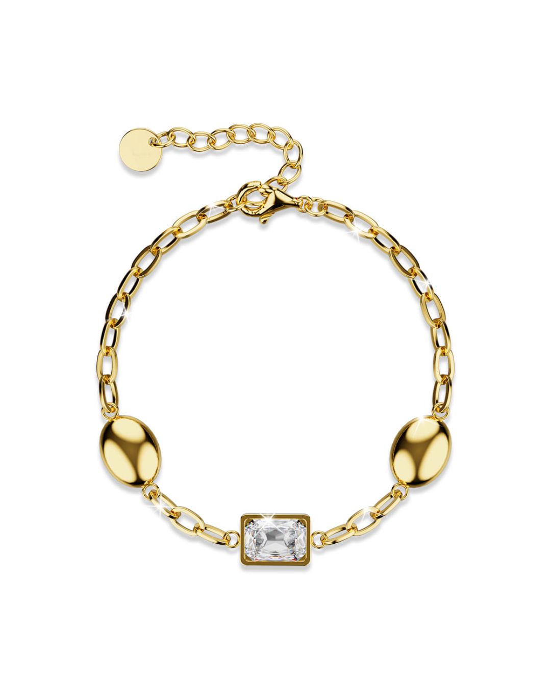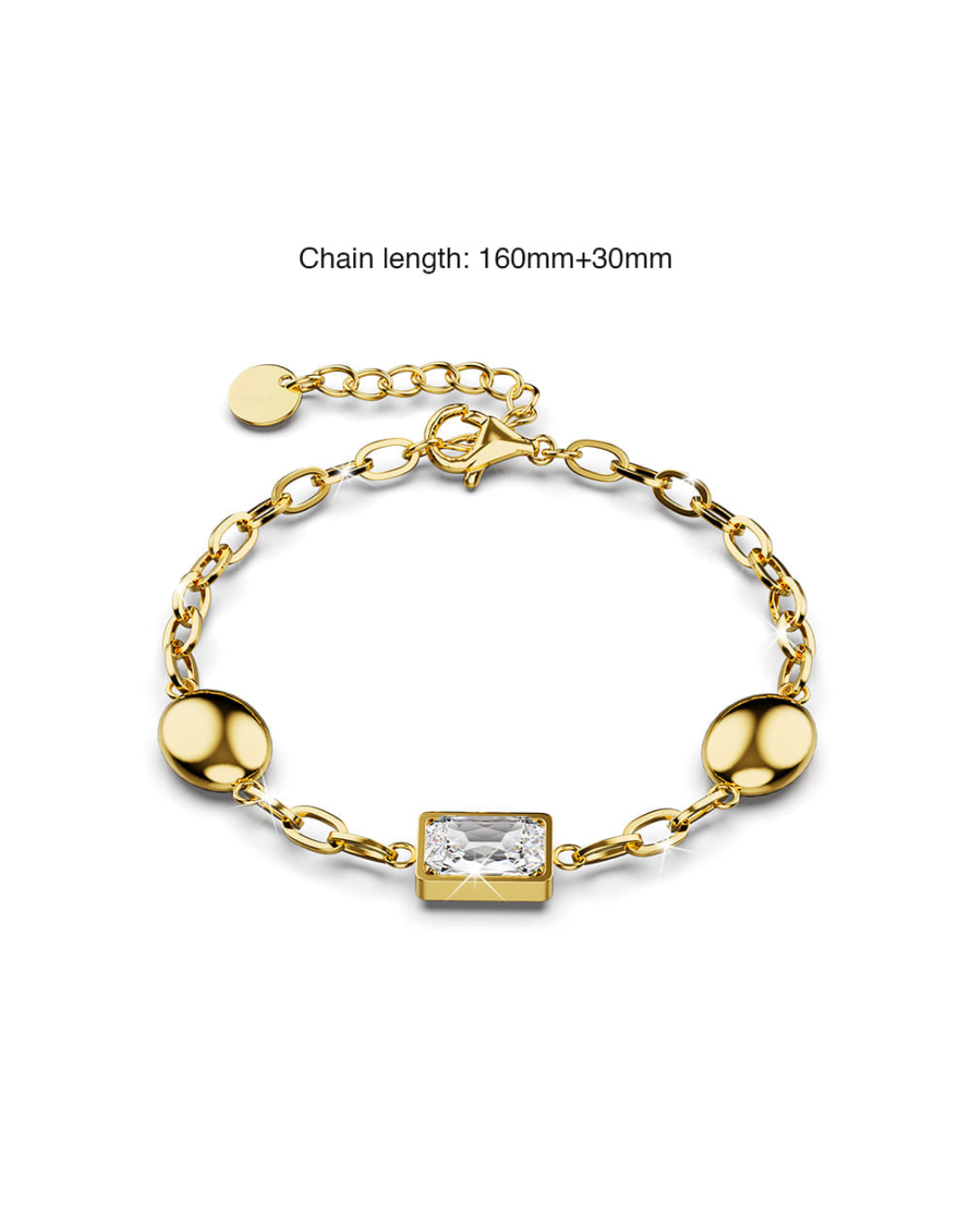 Bring a sophisticated, modern edge to your wardrobe with the 18ct gold-plated Oval Square Zirconia Bling Bracelet. Crafted from stainless steel and finished with a stunning layer of bright polish, this minimal geometric bracelet gives a nod to geometric shapes while retaining an impeccably elegant finish.