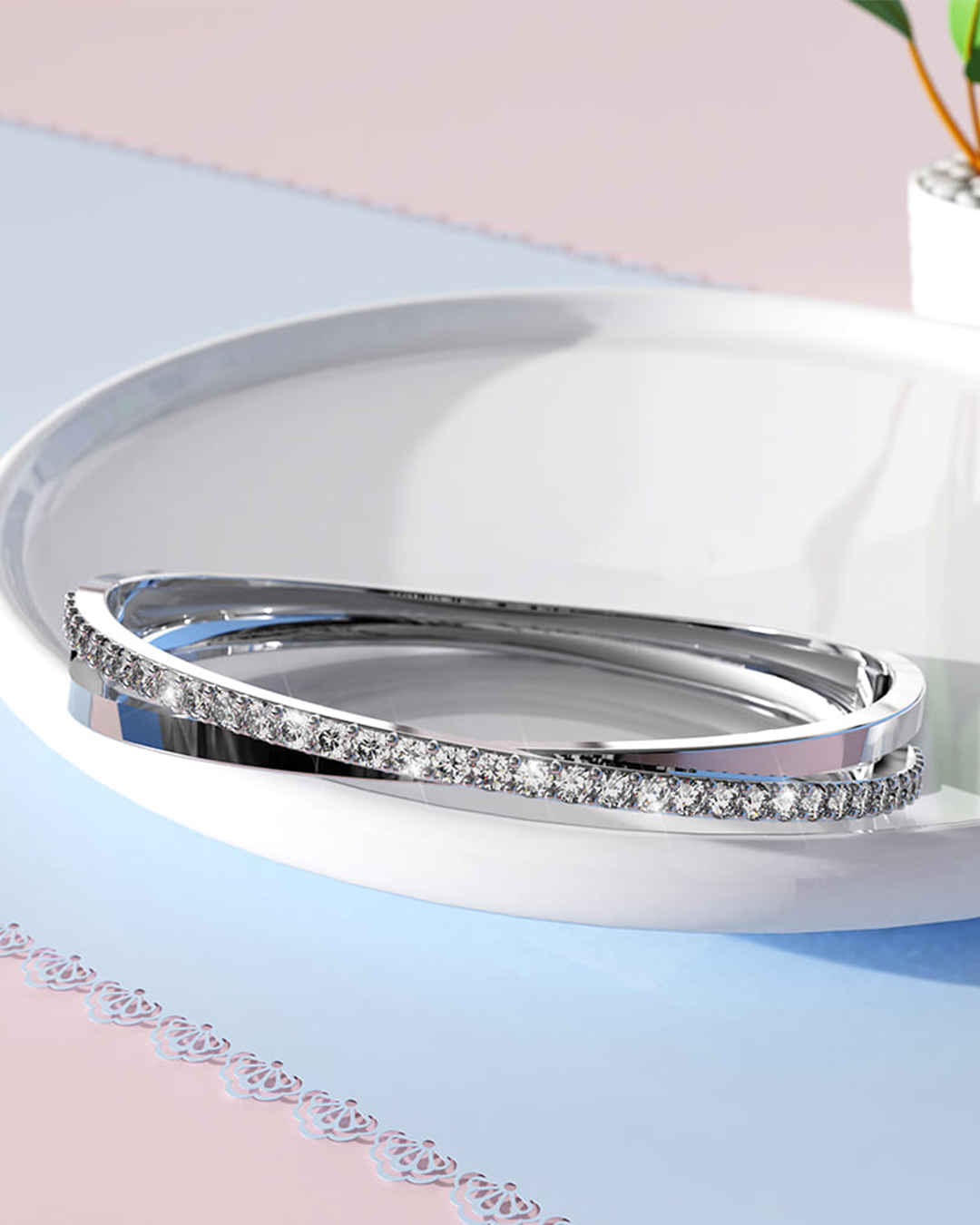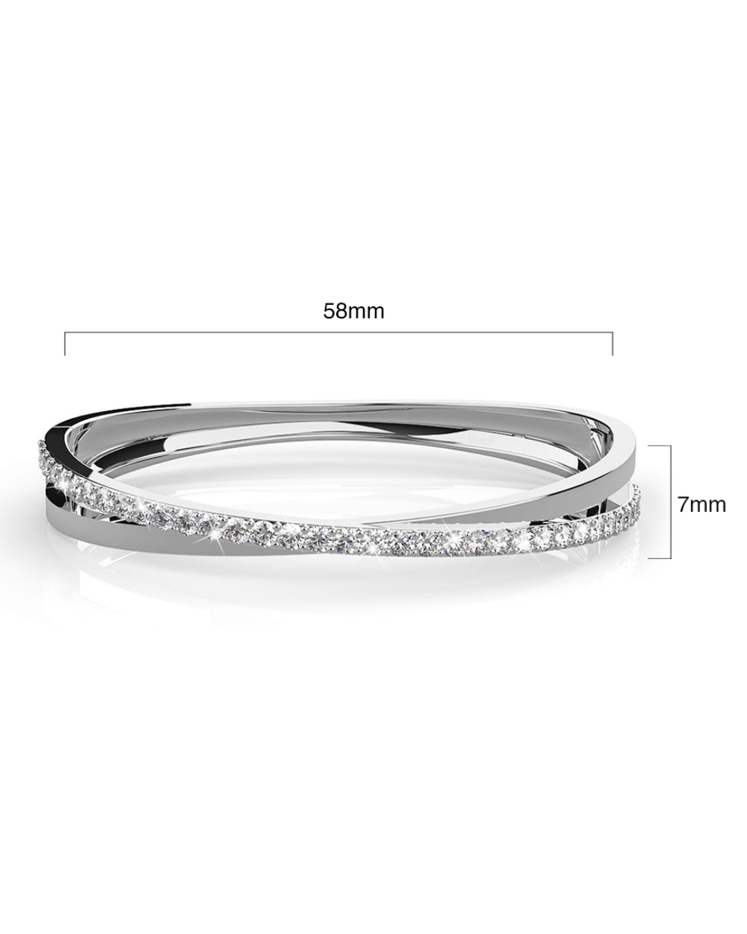 This criss cross design bangle embellished with Crystals from SWAROVSKI® is guaranteed to make you look gorgeous and confident inside out with its classic appeal and sparkling elegance. Crafted from 18K White Gold plated alloy with a high gloss finish, this bangle will be your next go to accessory.