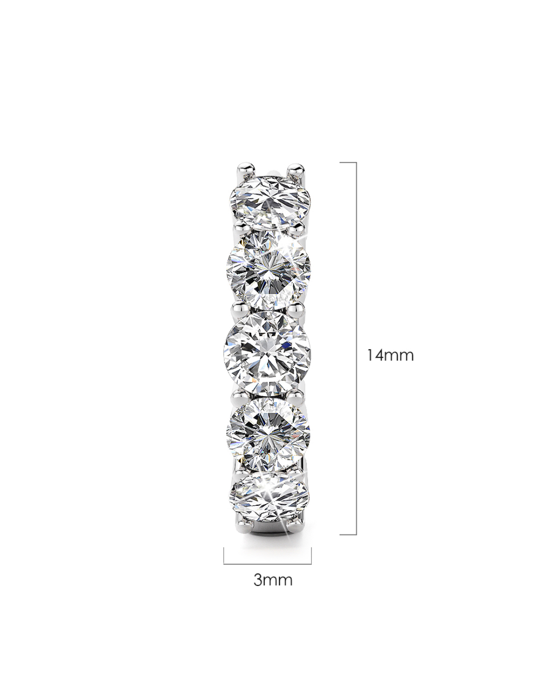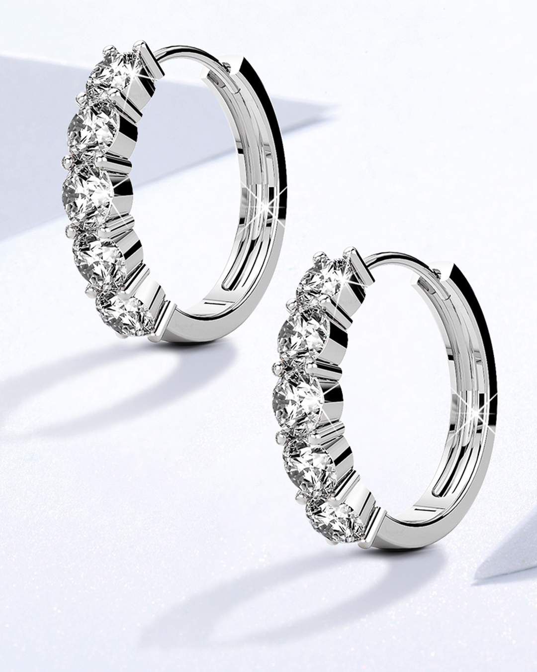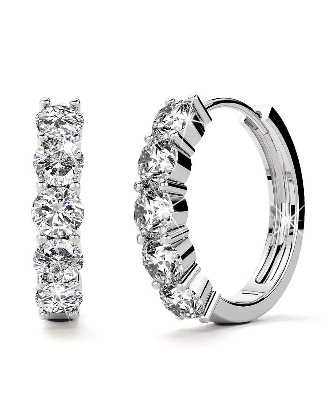 These pretty earrings are crafted of high gloss 18K White Gold plated alloy that is fashioned into a dainty hoop design. Each earring is embellished with 5 round-cut, prong set Crystals from SWAROVSKI® . An endearing & cheerful piece!
