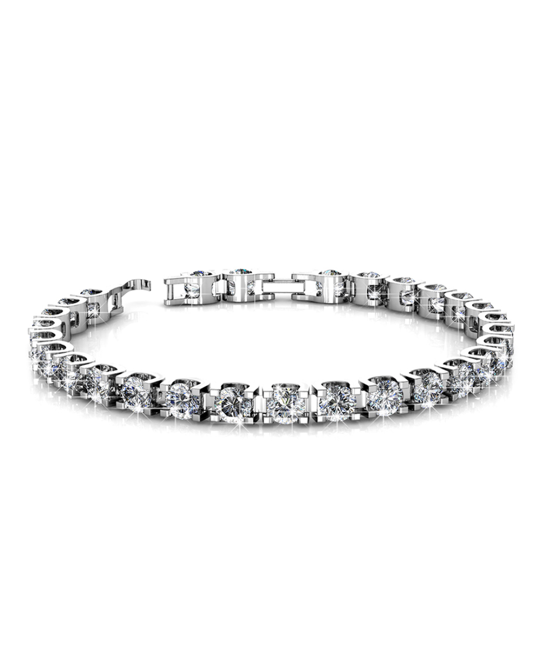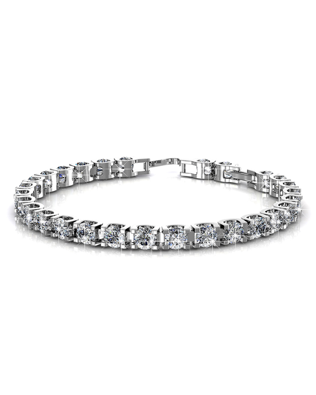 This tennis bracelet will definitely add an extra glow to your day. The stunning bracelet features brilliant round-cut Crystals from SWAROVSKI® in 18K White Gold plated alloy. A radiant and elegant piece!