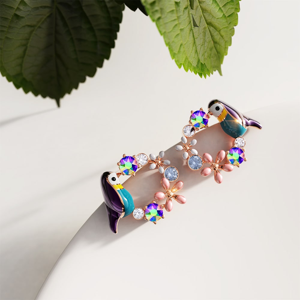 Add pop of colours to your outfit with these funky earrings! They are Rose gold plated, featuring a lovely bird with floral and decorated with Multicolour Austrian Crystals. This charming piece is definitely to steal!