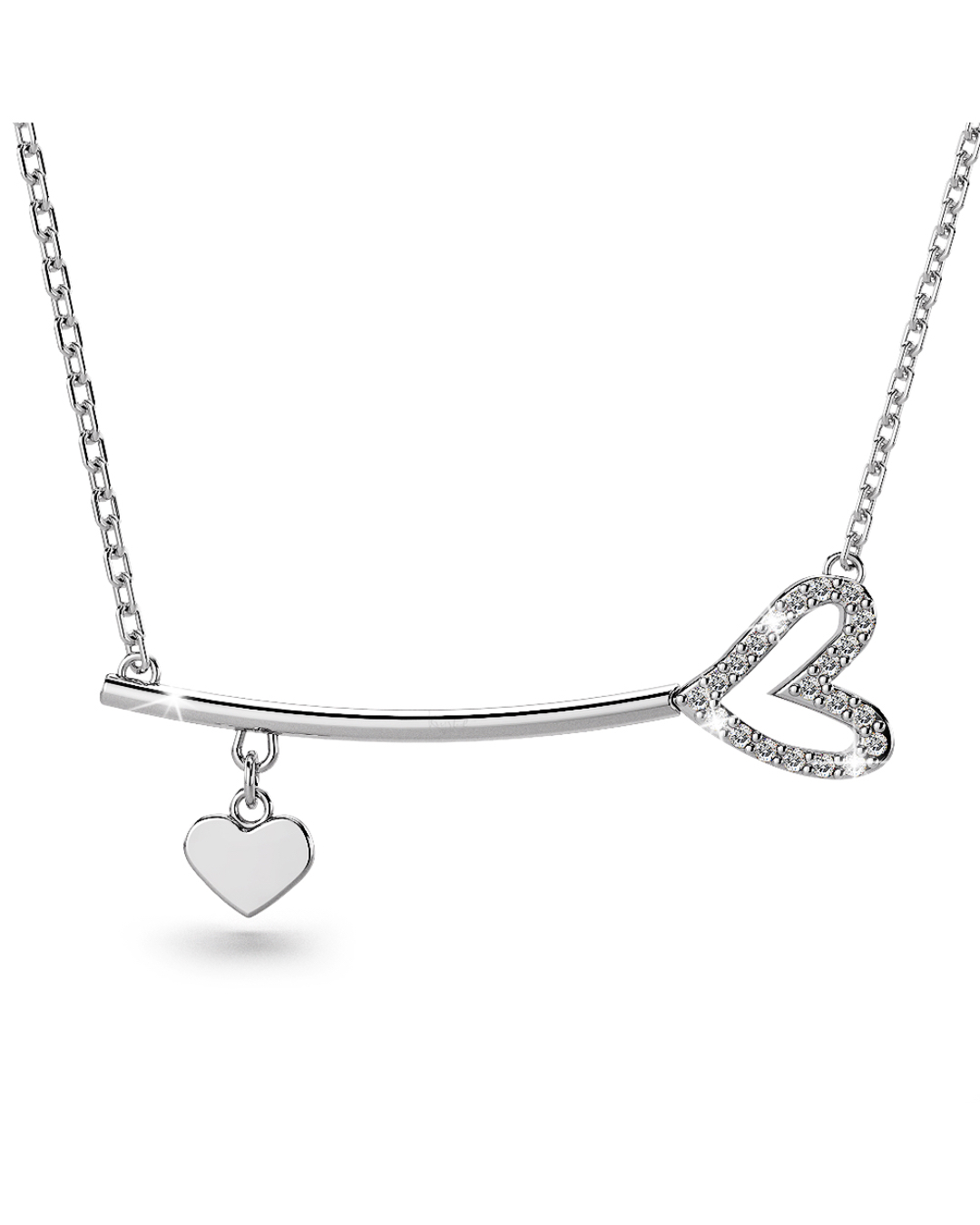 This charming necklace features a slightly bent bar with heart emblem studded with Crystals from SWAROVSKI® A cute heart shaped bling adds graceful and chic glam. Crafted of 18K White Gold plated alloy with high polish finish, this jewerly piece makes a perfect gift for a friend or special someone.