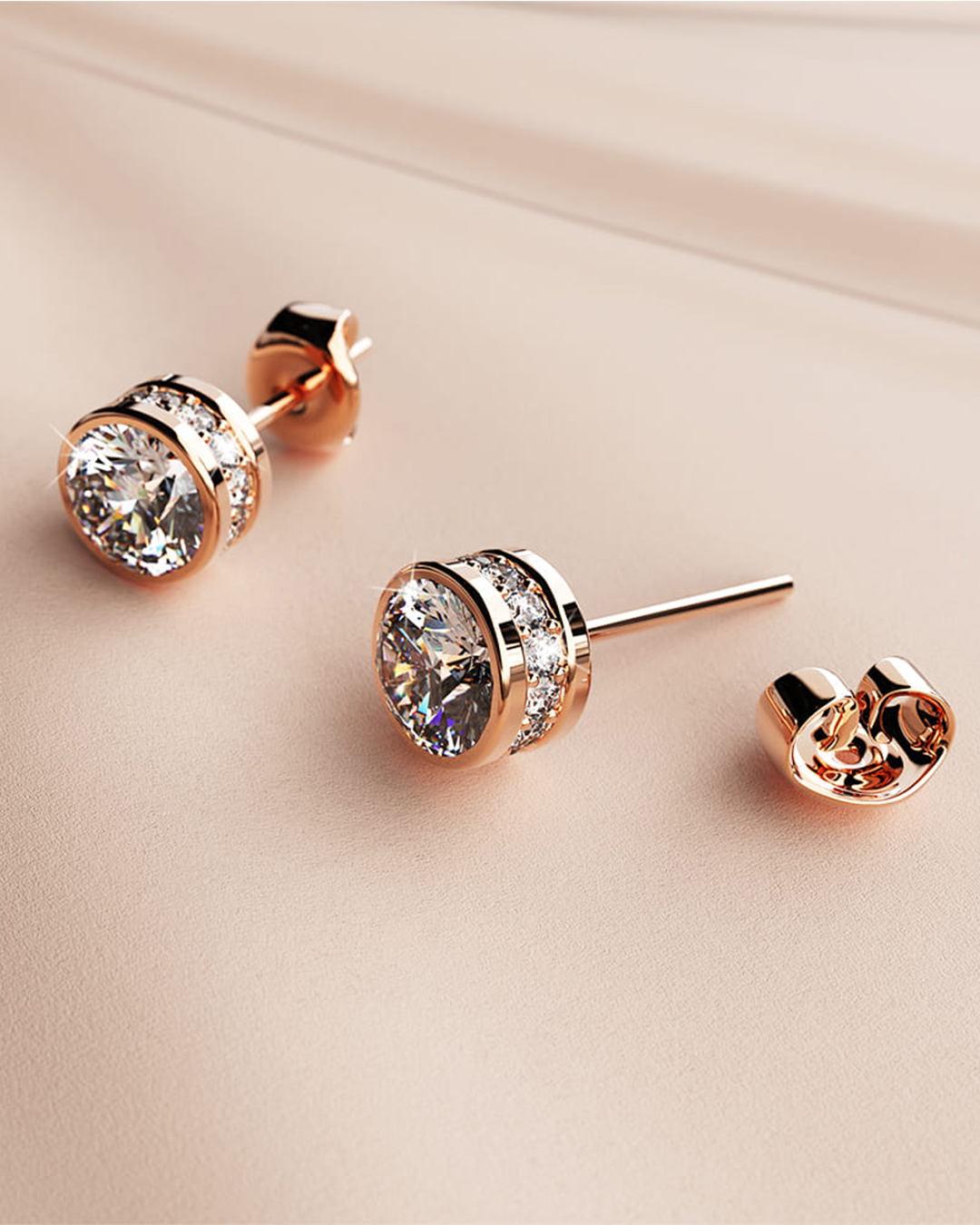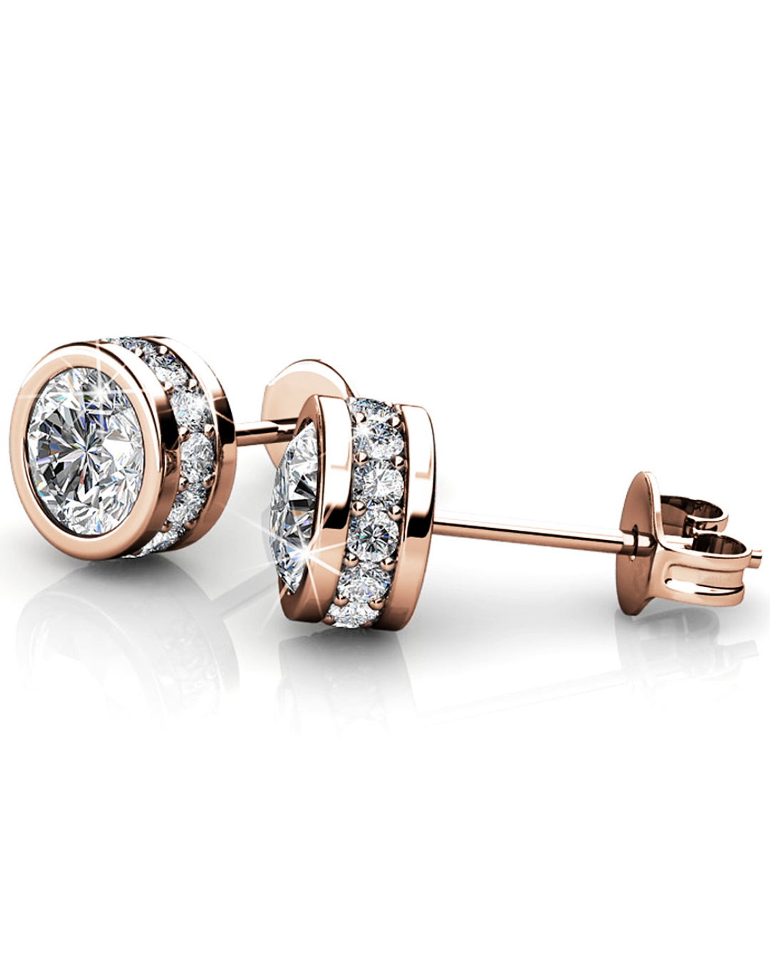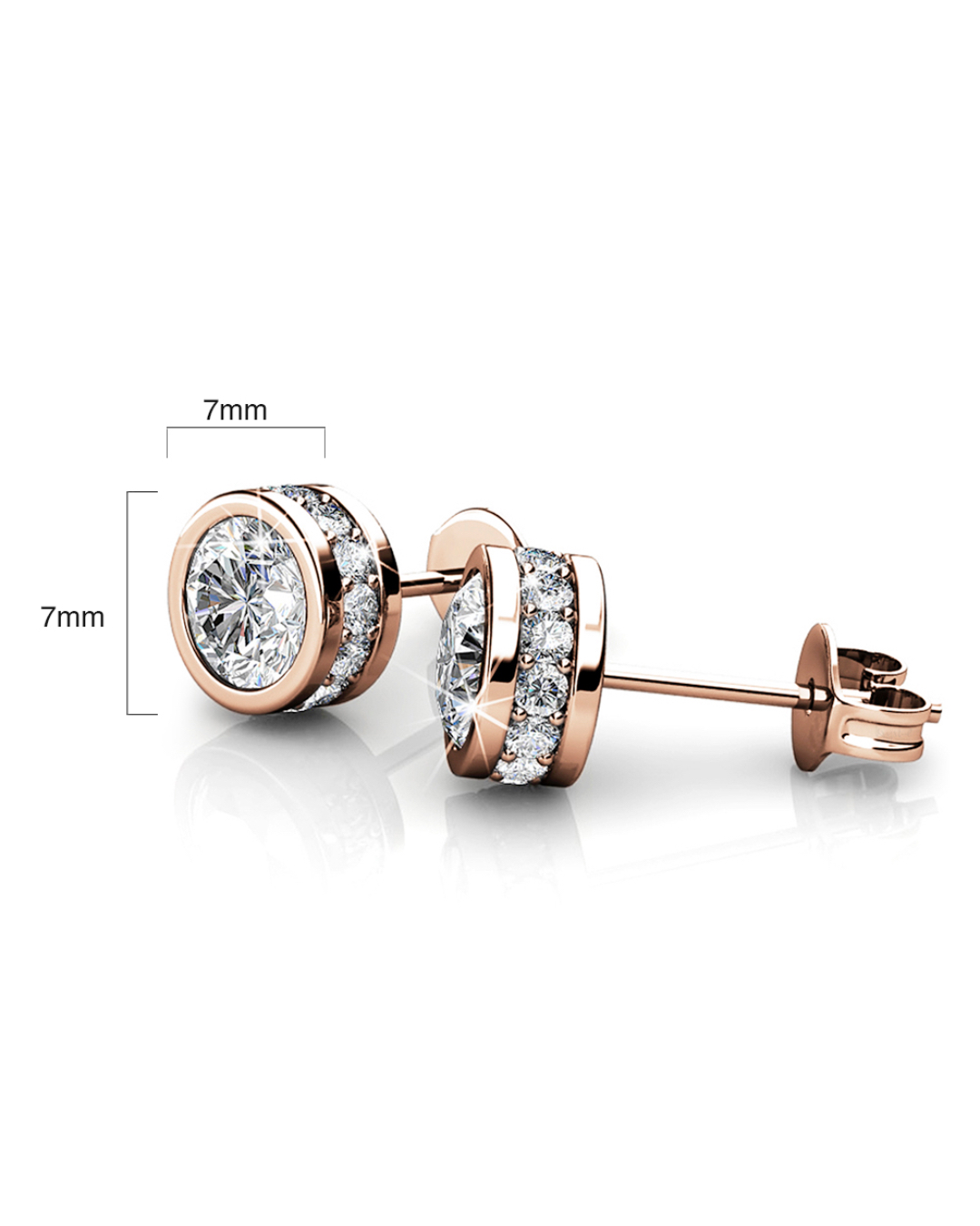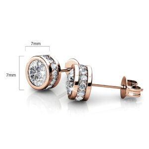 Beautify your ears with these classic studs featuring genuine Crystals from SWAROVSKI® Each earring showcases round-cut crystal measuring 7mm in diameter. These 18K Rose Gold plated earrings are buckled with butterfly backs that offer dependable security for all day comfort.