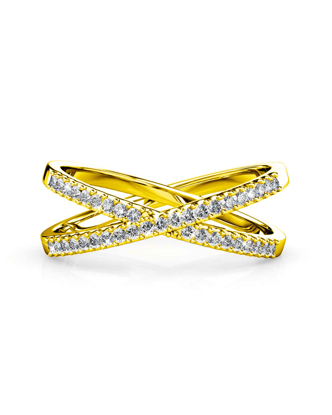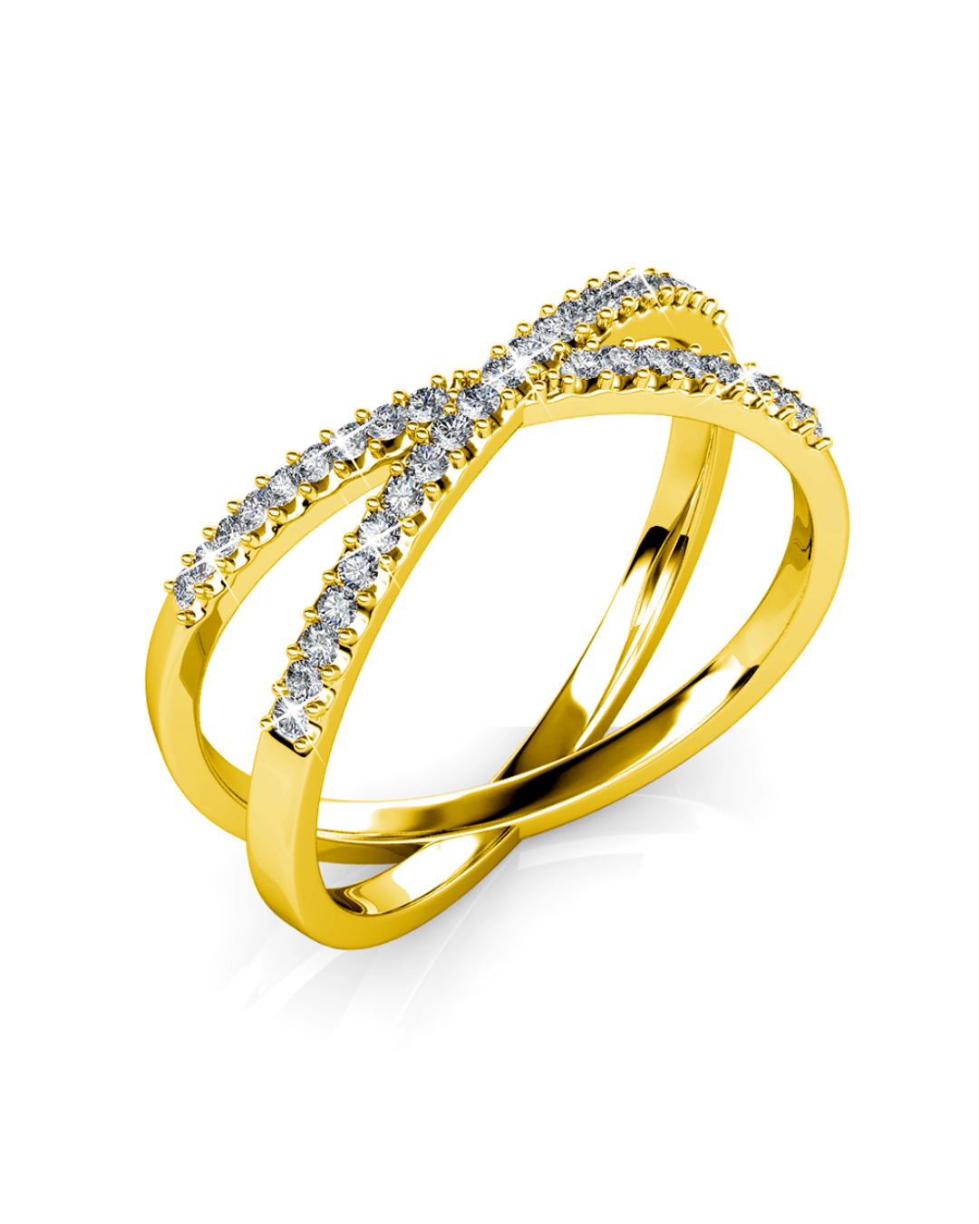 This graceful fashion ring embellished with genuine Crystals from SWAROVSKI® is intricately fashioned with a cross-band design. Half of the band is studded with multiple pave-set crystals. Crafted from highly polished 18K Gold plated alloy, this ring is a stunning addition to your casual or formal wear.