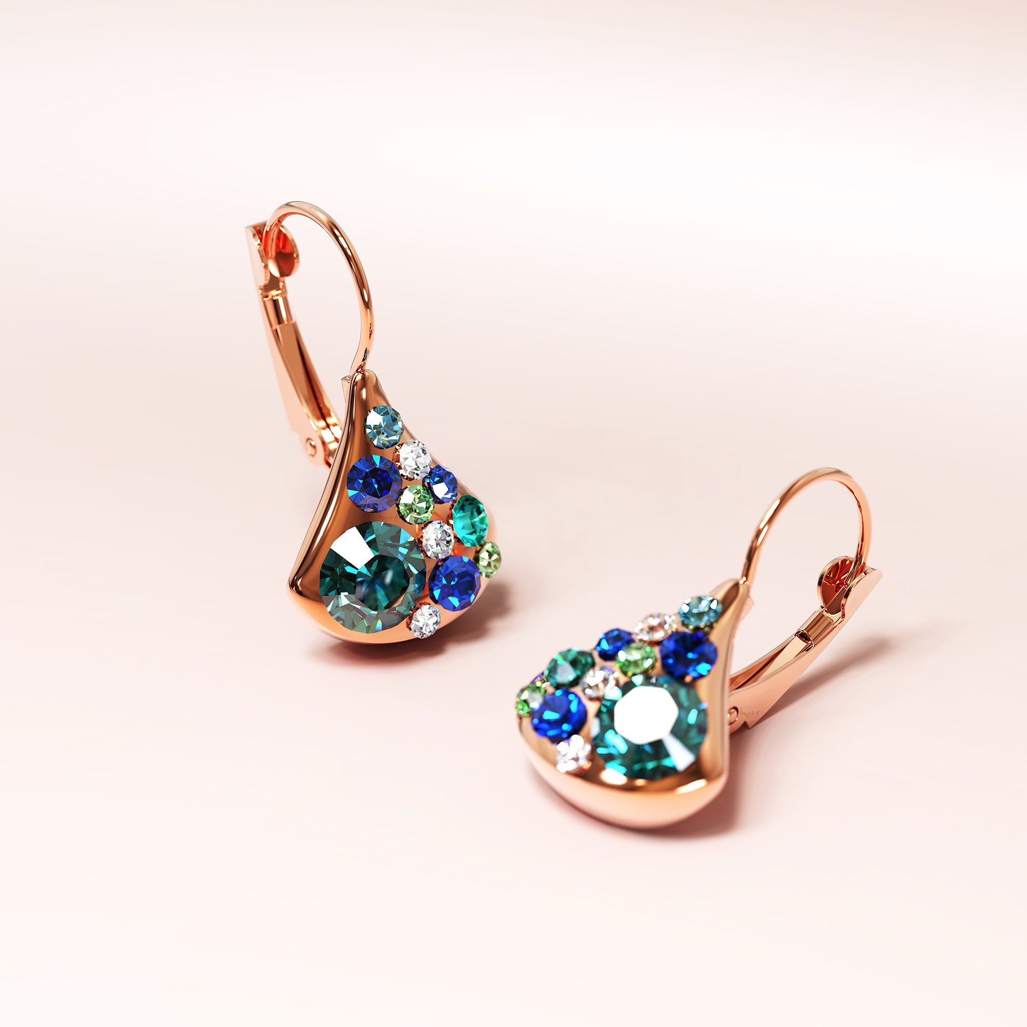 Exotic and magical! This fun shaped earring is plated with 18ct Rose Gold highlighting clustered multicolour Austrian Crystals for a simply lavish look. Perfect for a dinner or night event, these earrings will catch the night light and beam into anyone’s eyes.